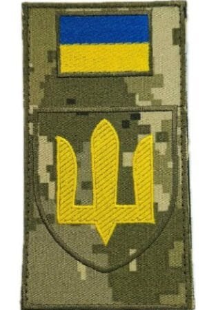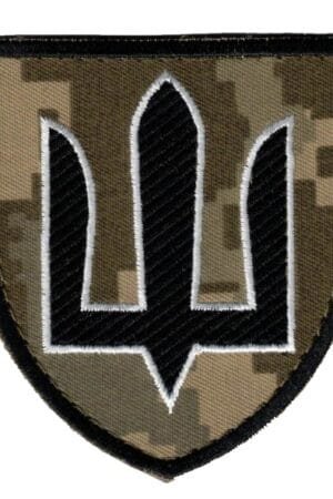 UKW19.Sleeve patch of Armed Forces of Ukraine. General Staff. Black Trident with White outline on MM-14 Pixel camouflage with Black edge. Velcro backing.