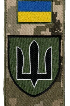 UKW20.Sleeve patch of Armed Forces of Ukraine with Flag. General Staff. Black Trident with White outline on OD with Black outline on MM-14 camouflage. Velcro backing