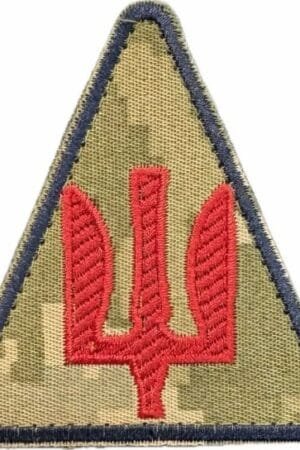 UKW162.Ukrainian Air Force Anti-Aircraft Missile Forces sleeve patch. Red Trident on Pixel camouflage with Blue border.