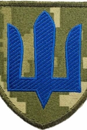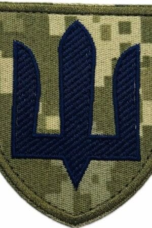 UKW185.Ukraine Trident sleeve patch. Mechanized Troops. Blue Trident on Pixel camouflage. Velcro backing.