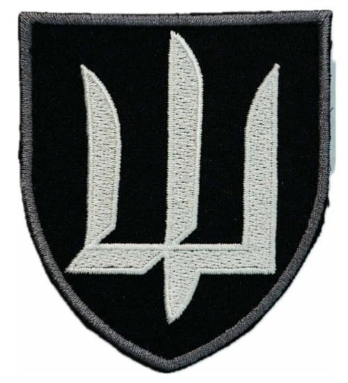 UKW10.Sleeve patch of Armed Forces of Ukraine. GRU Main Directorate of Intelligence. White Trident on Black. Velcro backing.