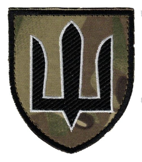 UKW18.Sleeve patch of Armed Forces of Ukraine. General Staff. Black Trident with White outline on Multicam with Black edge. Velcro backing.
