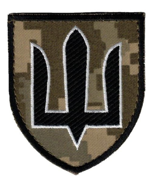 UKW19.Sleeve patch of Armed Forces of Ukraine. General Staff. Black Trident with White outline on MM-14 Pixel camouflage with Black edge. Velcro backing.